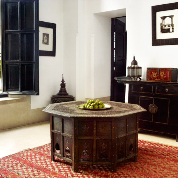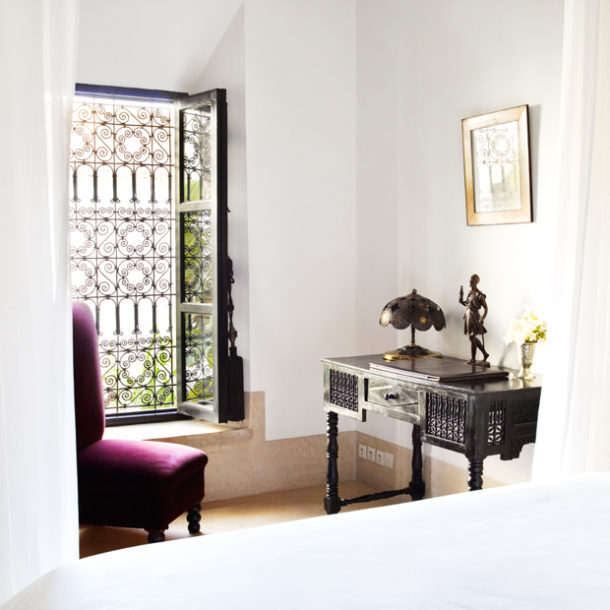 Die Asilah Suite begrüßt Sie in Form einer Suite von Zimmern in der ersten Etage. Der Sitzbereich besticht mit einem offenen Kamin. Angrenzend befindet sich ein farbenfrohes Tadelakt-Badezimmer. Große Fenster und ein großes Dachfenster lassen viel Tageslicht herein. Das Schlafzimmer mit seinem Himmelbett, einem geräumigen Schrank und einem Schreibtisch bietet Aussicht auf den Hofgarten und den Pool.