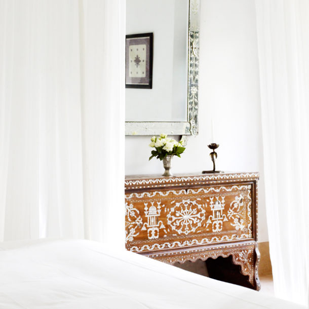 Die Tangier Suite begrüßt Sie in der ersten Etage mit großen Fenstern mit Blick auf den Hofgarten. Diese Suite kann mit der Fez Suite zu einer Familien-Suite verbunden werden. Traditionelle Möbel mit Perlmuttintarsien gehören hier zum Interieur der Tangier Suite. Der marokkanische Lounge-Alkoven ist ein wunderbarer Ort zum Entspannen und Wohlfühlen. Das King-Size-Himmelbett schirmen weiße Voilegardinen von der Außenwelt ab. Ein begehbarer Schrank führt direkt in das Tadelakt-Badezimmer.